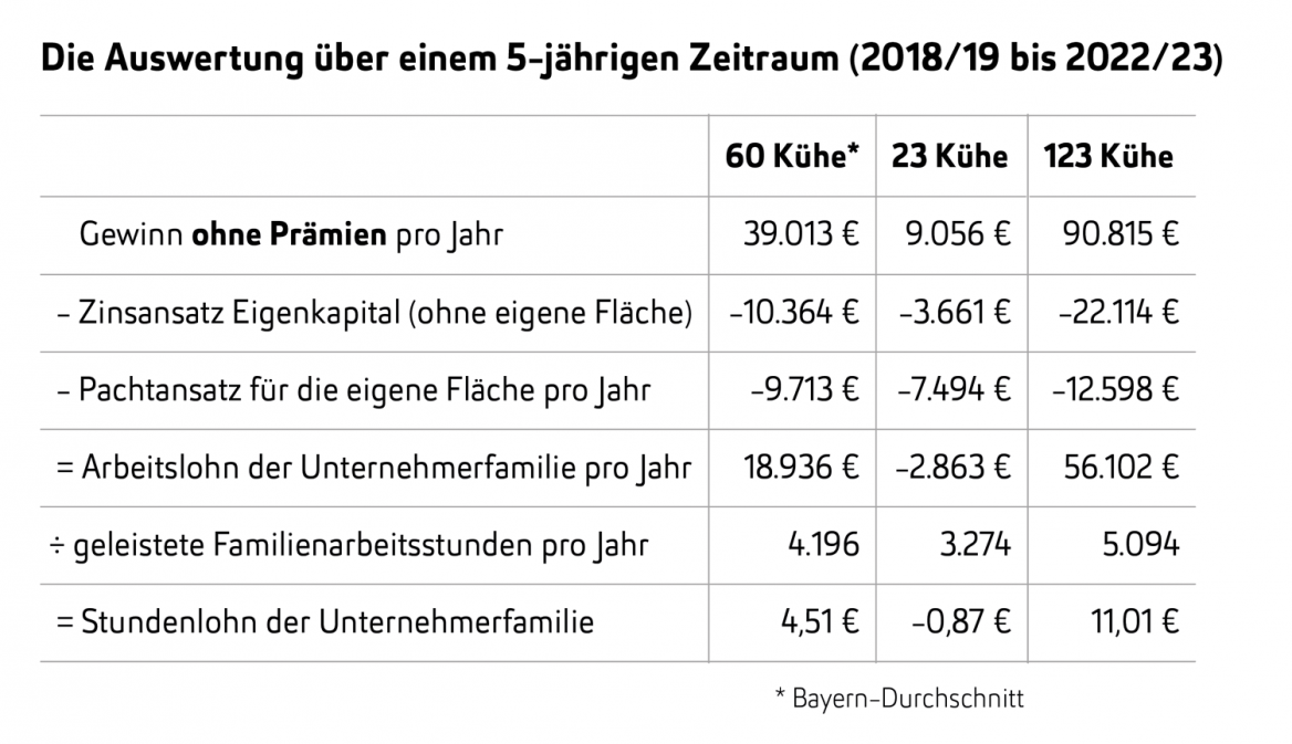 Ohne diese Prämien sinkt beim bayerischen Durchschnitts-Milchviehbetrieb mit 60 Kühen der Stundenlohn auf 4,51 Euro ab. Bei kleinen Betrieben mit 23 Kühen fällt er sogar ins Negative (-0,87 Euro). Selbst größere Betriebe mit 123 Kühen erreichen nur 11,01 Euro.