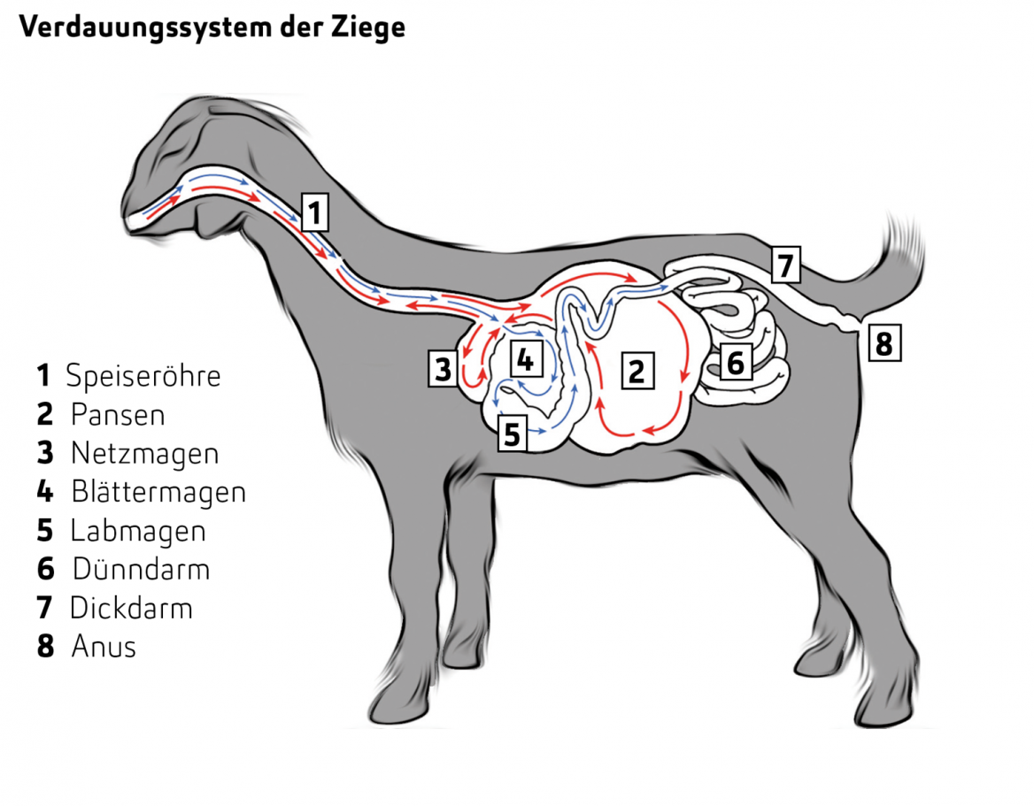 Und eben auch Ziegen, die insgesamt vier Mägen haben: Pansen, Netzmagen, Blättermagen und Labmagen. Jeder dieser Mägen hat eine spezielle Aufgabe, die wichtig ist, damit Ziegen genug Nährstoffe aufnehmen und in Energie umwandeln können.