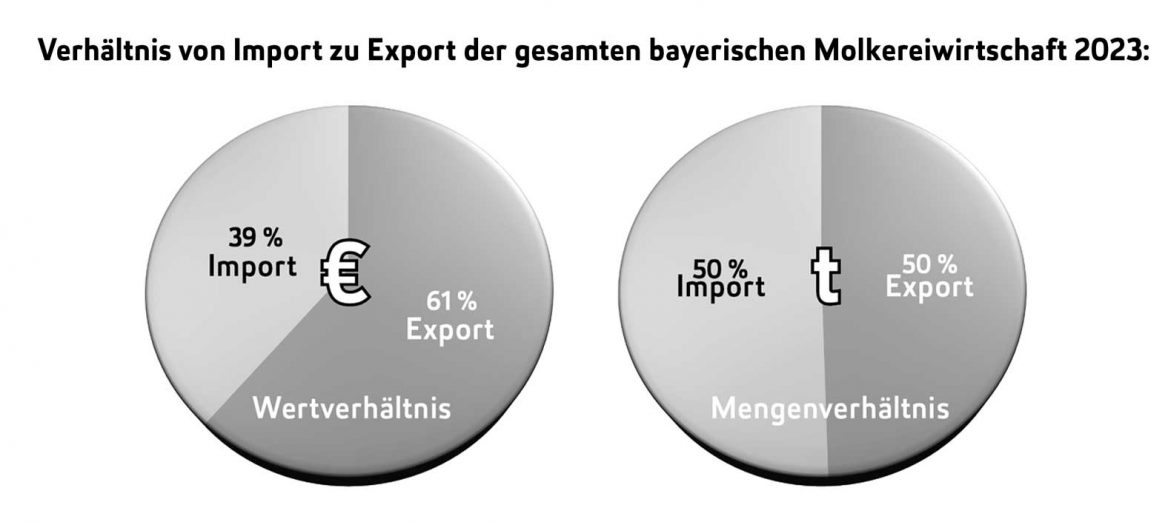 Die Bayerischen Exporte von Milch und Milcherzeugnissen umfassten im Jahr 2023 insgesamt 938.500 Tonnen im Wert von über 1.3 Milliarden Euro. Davon gingen 80,0 % in die Länder der Europäischen Union. Bei den Importen nach Bayern erreichte die eingeführte Menge 1,27 Millionen Tonnen im Gesamtwert von knapp 950 Mio. Euro, wobei 96,5 % aus der EU stammten. Dem recht ausgeglichenen Verhältnis von Export zu Import bei der produzierten Menge steht in finanzieller Hinsicht bei den Ausfuhren ein sattes Plus gegenüber.