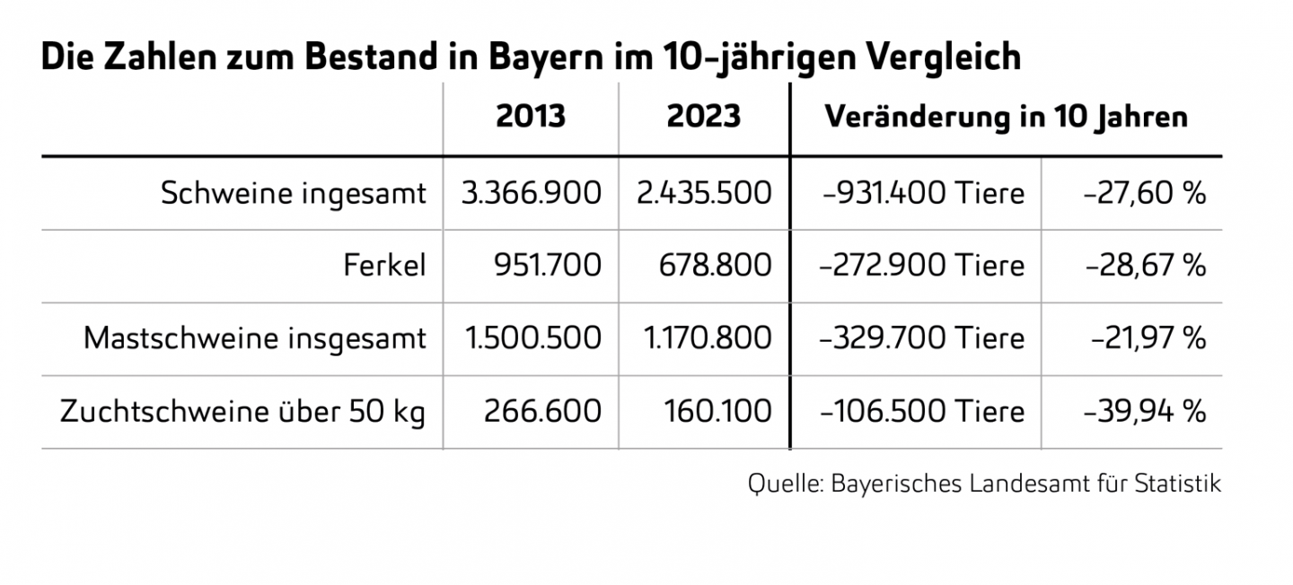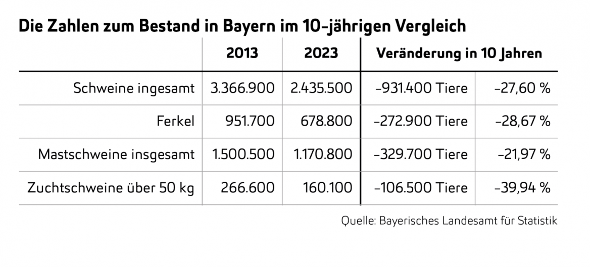 In den letzten zehn Jahren ist der Schweinebestand in Deutschland um 25,4 % oder 7,1 Millionen Tiere gesunken. Diese Entwicklung geht einher mit einer Verringerung der Anzahl der Betriebe. Größere Betriebe sind im Trend: Im Jahr 2014 hielt ein Betrieb im Durchschnitt 1.000 Schweine, während es zehn Jahre später 1.300 Tiere pro Betrieb waren.