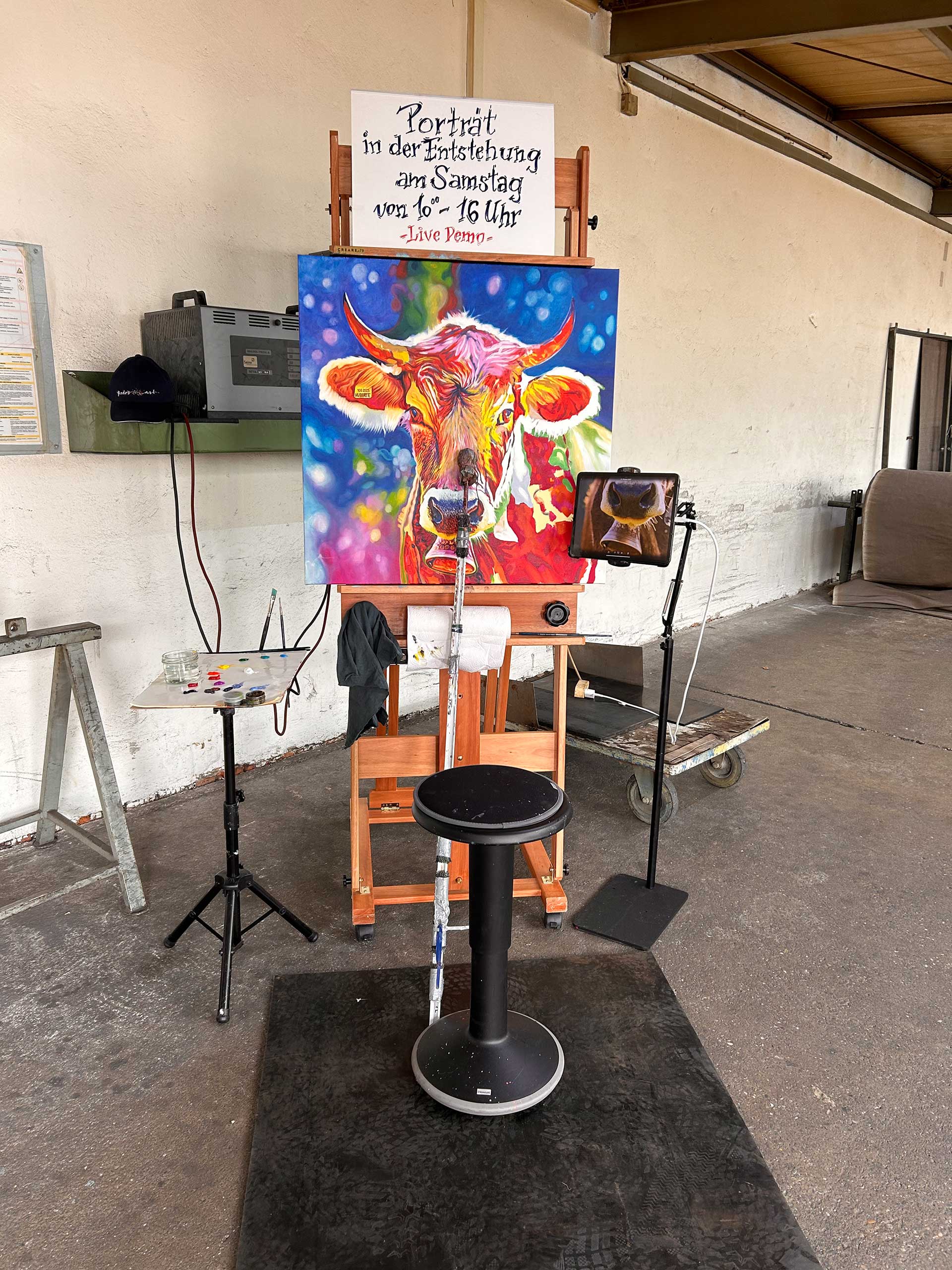 An diesem letzten Tag konnten die Besucher auch einen Einblick in meine Arbeitsweise gewinnen, während ich vor Ort an dem Porträt der Kuh „Huberte” malte.